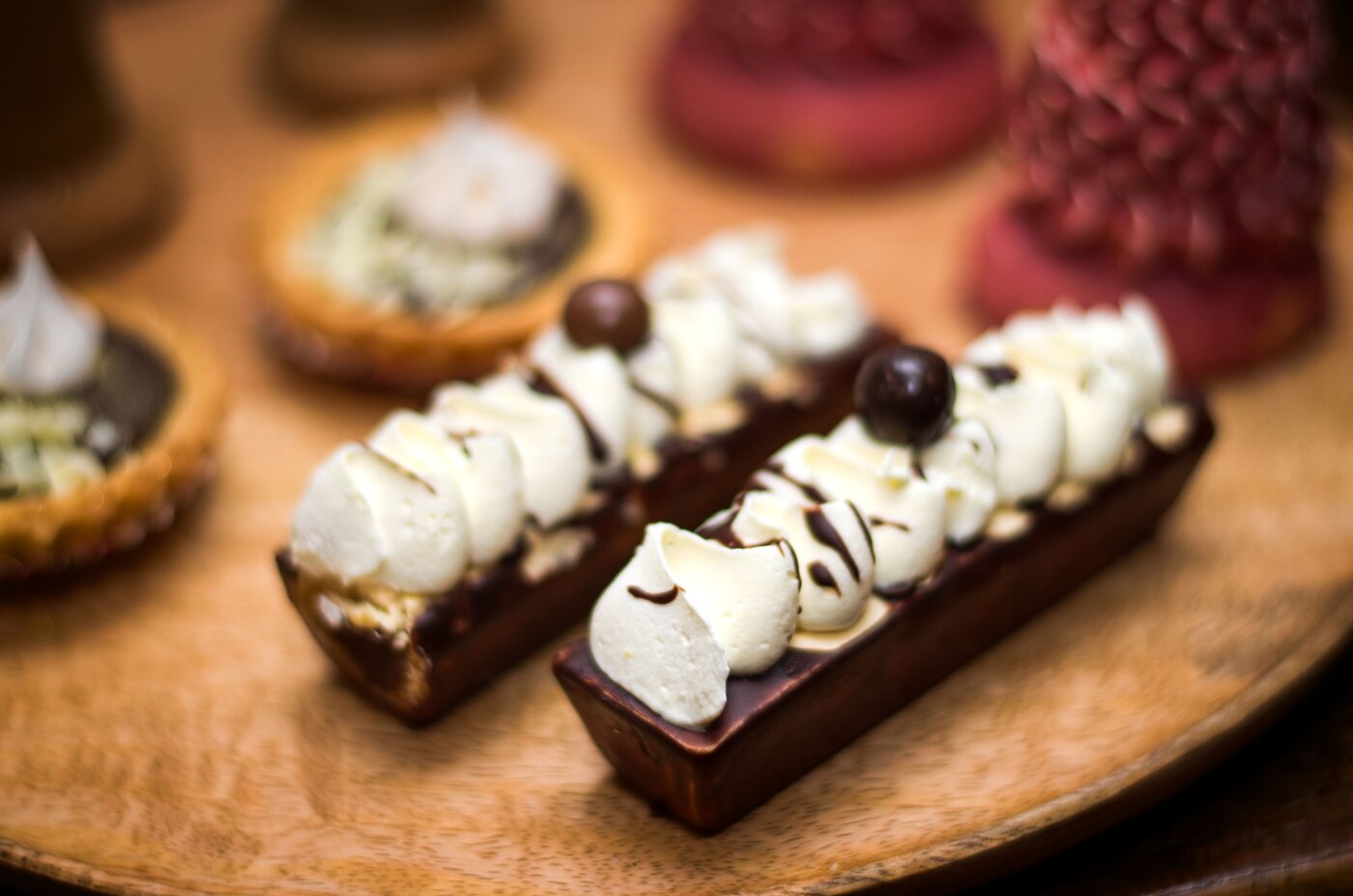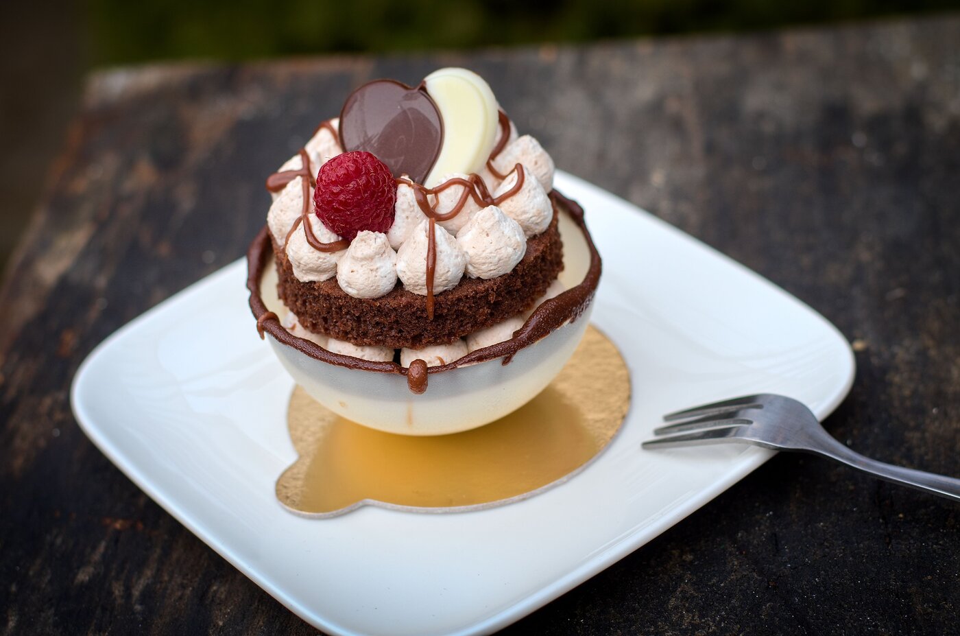 Nugátový dezert v bílé čokoládové vaničce se šlahačkou a malinami   (55 Kč)